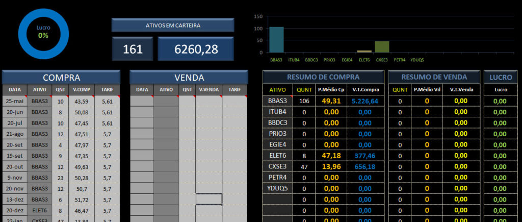 Tudo que vai depender de você será apenas fazer a anotação da data e do Ativo comprado, valor de compra e a tarifa paga. A planilha já lhe dá o valor médio de seus Ativos, individualmente, independente da data de compra.