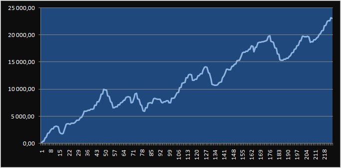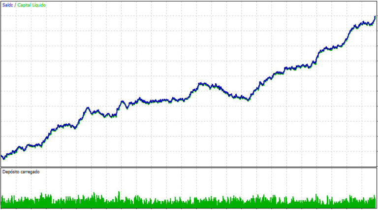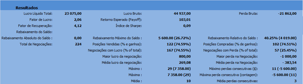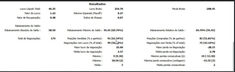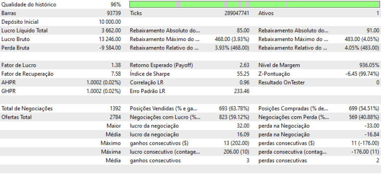 O teste feito foi com um robô Rogue, versão 3.2 que faz operações nas duas direções. Em um horário determinado ele faz uma entrada de compra e venda ao mesmo tempo e gerencia o ganho movendo os stops. Neste caso, quase sempre, haverá uma perda para cada ganho. Esse é o motivo do “índice de sharpe” se tão baixo. O objetivo do robô é buscar sempre um ganho maior que a perda.